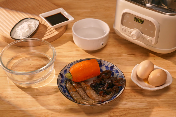 4、墩墩锅去掉蒸架,将切碎的胡萝卜、虾仁、木耳放入墩墩锅中,加入生抽、淀粉和半碗水,选择“快煮模式”炒熟。