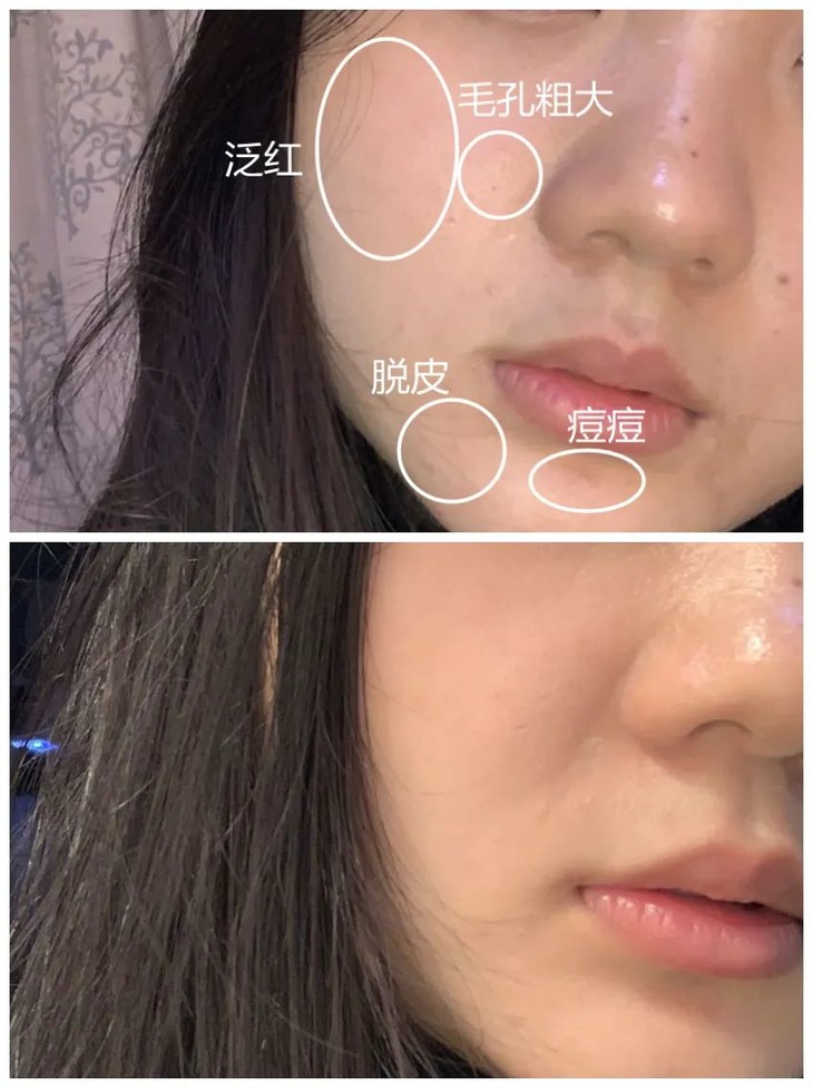 皮肤屏障受损严重,蜕皮和红血丝非常明显,还有灼热刺痛的感觉。那段时间不管用多少大牌面霜都“吃”不进去,每天上妆还闷痘不服帖,不适感非常强烈。
