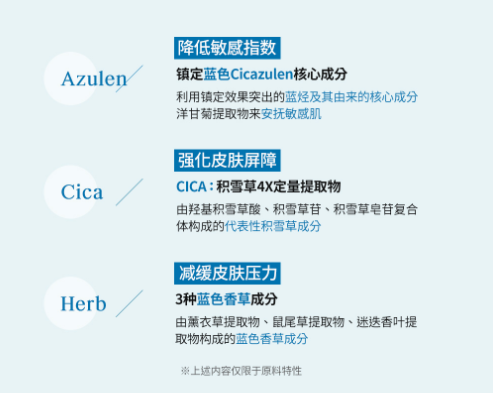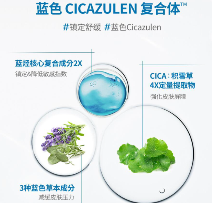 从2000朵蓝艾菊中仅能提取出1g的珍稀成分,加上4×积雪草复合成分、3种蓝色草本成分,能有效镇定并舒缓受到刺激而变敏感的肌肤,促进受损肌肤加快生长,强化皮肤屏障。
