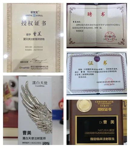 10余年来,曹院长凭借过硬的专业知识和丰富的临床经验,在注射美容领域取得了行业和众多品牌的认可。她先后担任过重庆市医学会整形美容分会委员、中国整形美容协会互联网医美分会第二届理事会理事等社会职务,她被爱贝芙、宝尼达、濡白天使针、伊妍仕少女针、乔雅登、BOTOX、艾莉微、嗨体等众多品牌产品认证为指定注射专家医师,被评为美国艾尔建年度人气医师,韩国艾莉薇金手指认证专家,在2019获得重庆市医学会整形美容分会青年医师大赛“优秀奖”。