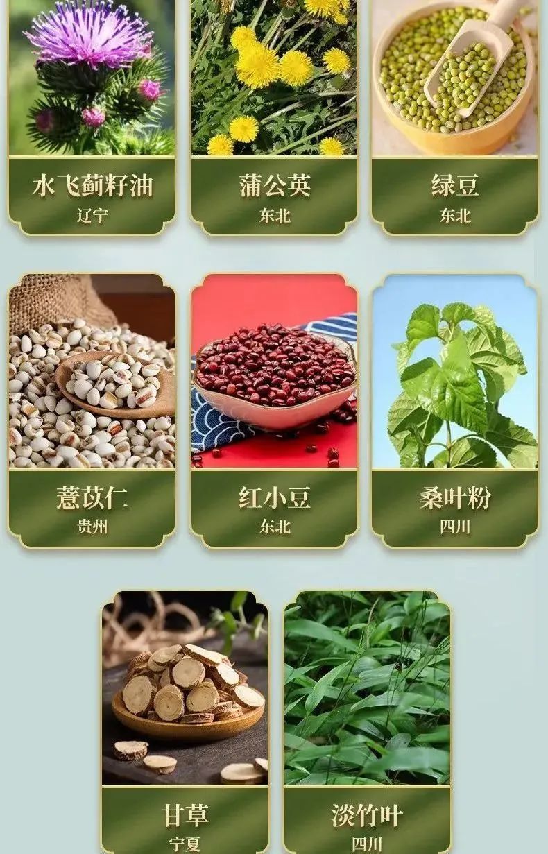 除了水飞蓟,还有蒲公英、桑叶、绿豆、淡竹叶5种绿色食材,给人以清新、鲜活之感。