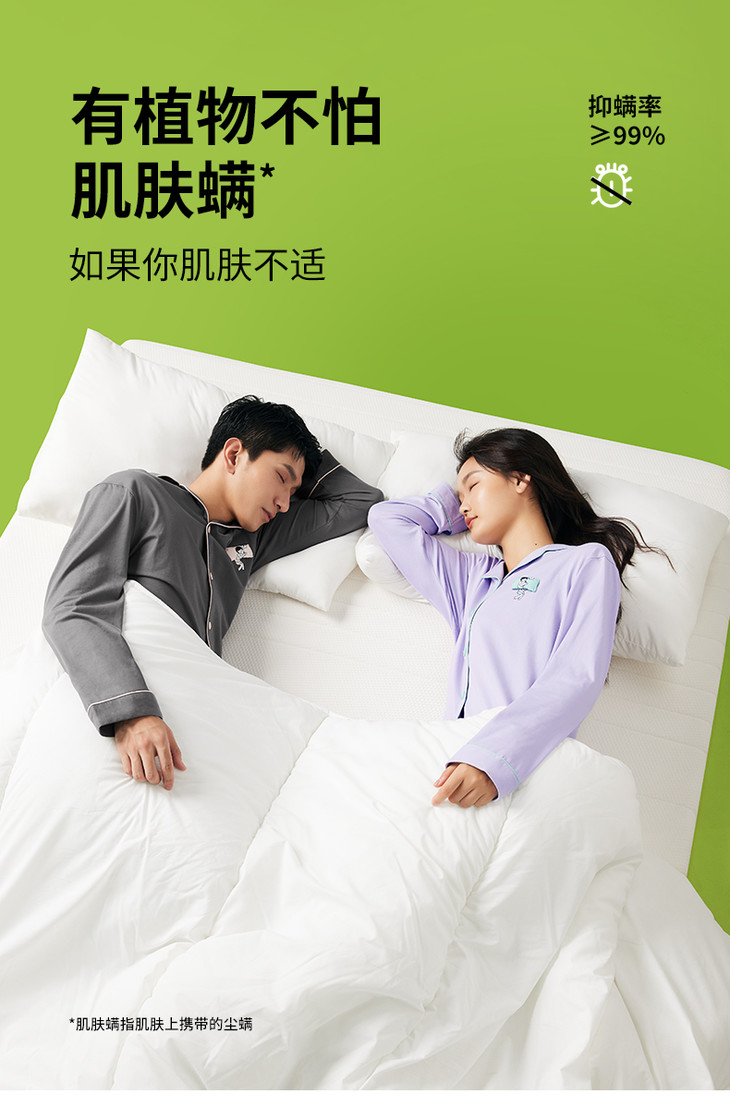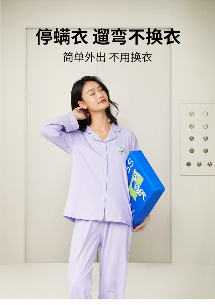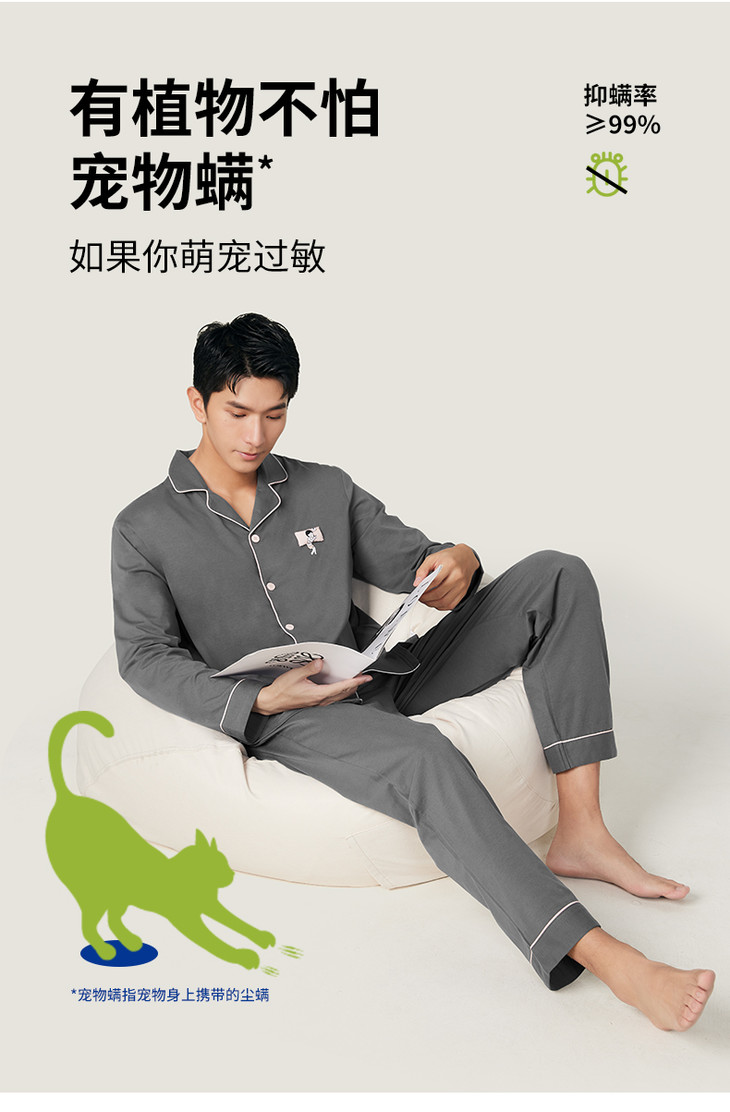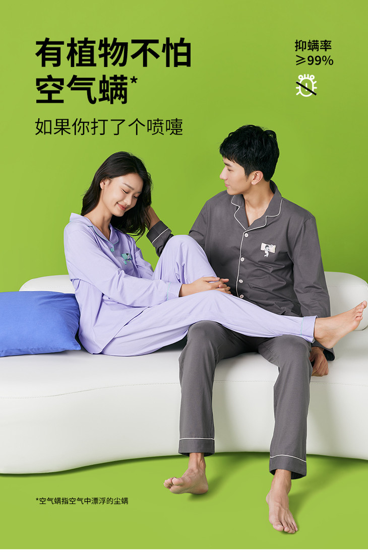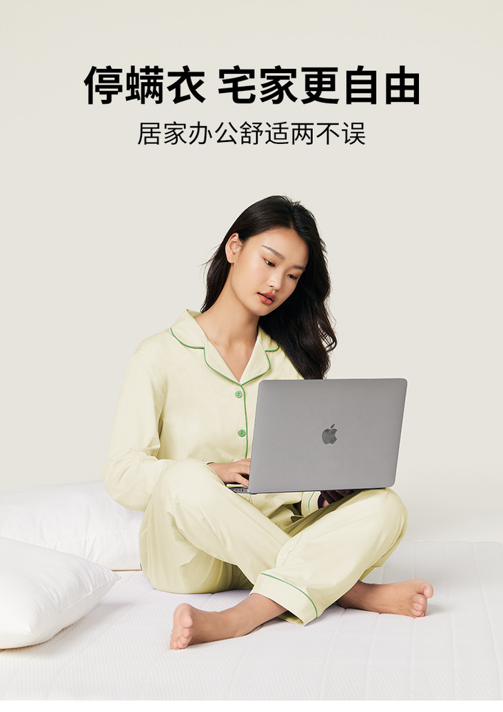 天气阴冷潮湿,细菌和螨虫滋生,虽然看不见也摸不着,也总免不了担心,一想起来都会觉得哪里痒痒的。家居服如果能抗菌、防螨,听起来都会让人更加安心。这款停螨衣的面料,经过防螨抗菌整理剂处理。对螨虫的驱避率,对大肠杆菌、金黄色葡萄球菌和肺炎克雷白氏菌的抑菌率,都超过了99%。能真正让人穿得舒适、安心。