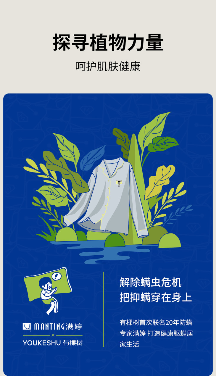 有棵树首次联名20年防螨专家满婷,打造健康驱螨居家生活,这款植物停螨衣,面料经过抗菌、防螨处理,贴肤穿更舒服安心。面料轻轻柔柔,松松软软的,触感超好,吸湿透气好,穿起来特别舒服。