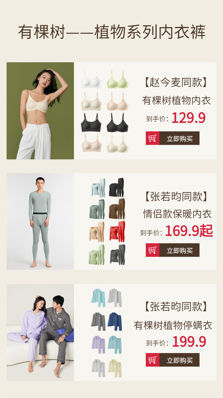 有棵树创立于2017年,以自由、极致、创新、环保为品牌理念,主张“无拘束”的生活态度。围绕消费者的基本穿着需求,重新设计了内裤、内衣、袜子、保暖内衣等诸多衣物基本款。基于消费者关注到产品的颜值与实用性双方面的需求洞察,有棵树通过自主研发和不断改进材质、体感等,陆续孵化出“抗菌”“逛逛”“小碳黑”等系列科技产品。