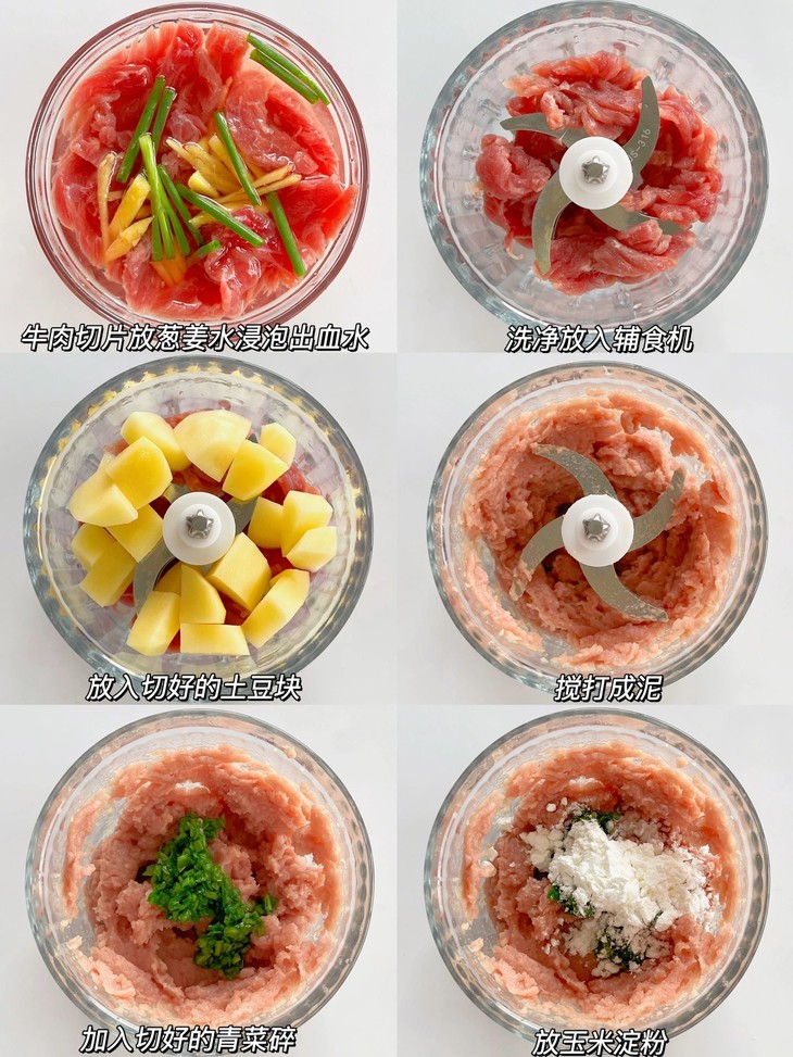 ❷洗净放入辅食机,放入切好的土豆块搅打成泥,加入青菜碎和玉米淀粉