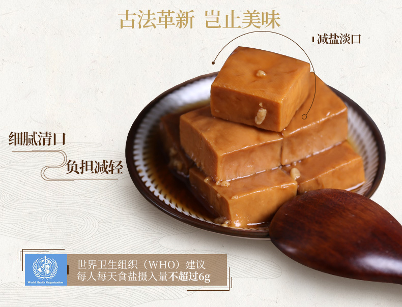 经过不断试验,平衡美味与健康,成就了现在低盐淡口的腐乳版本