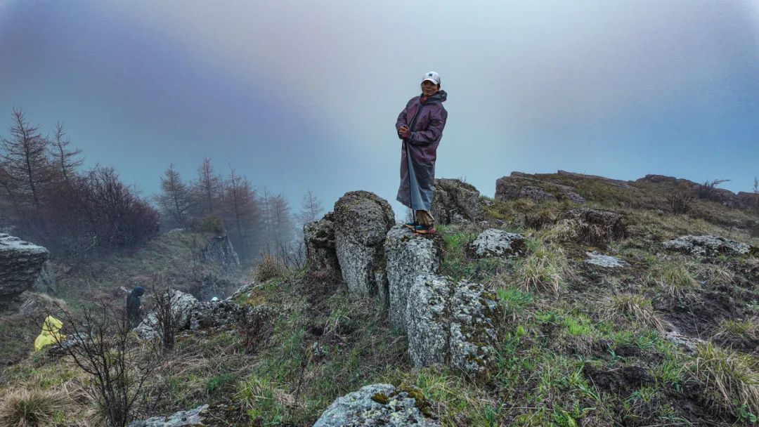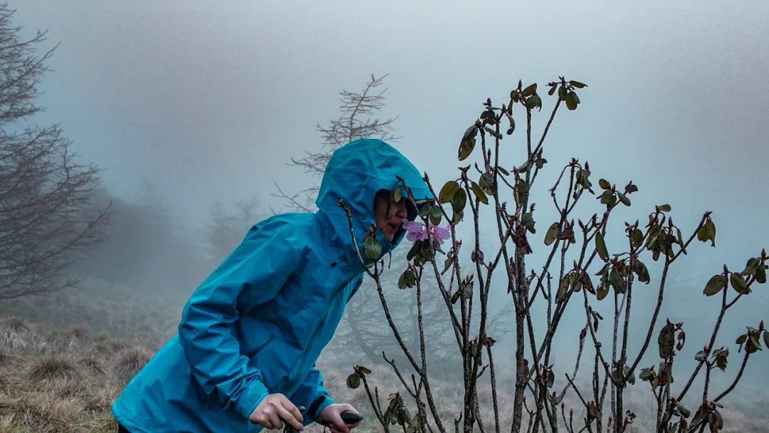 还没一会儿便到达当晚营地,放下背包轻装上老君山,彼时天色已晚,山上的雾越起越大,沿路只见几朵孤单的杜鹃花在风雨中飘摇。