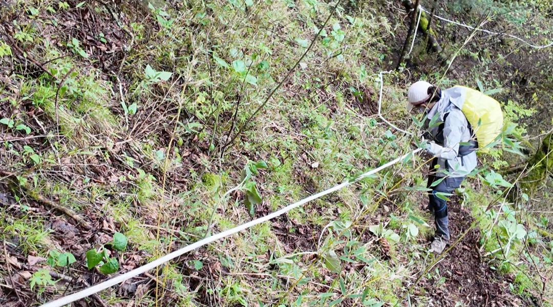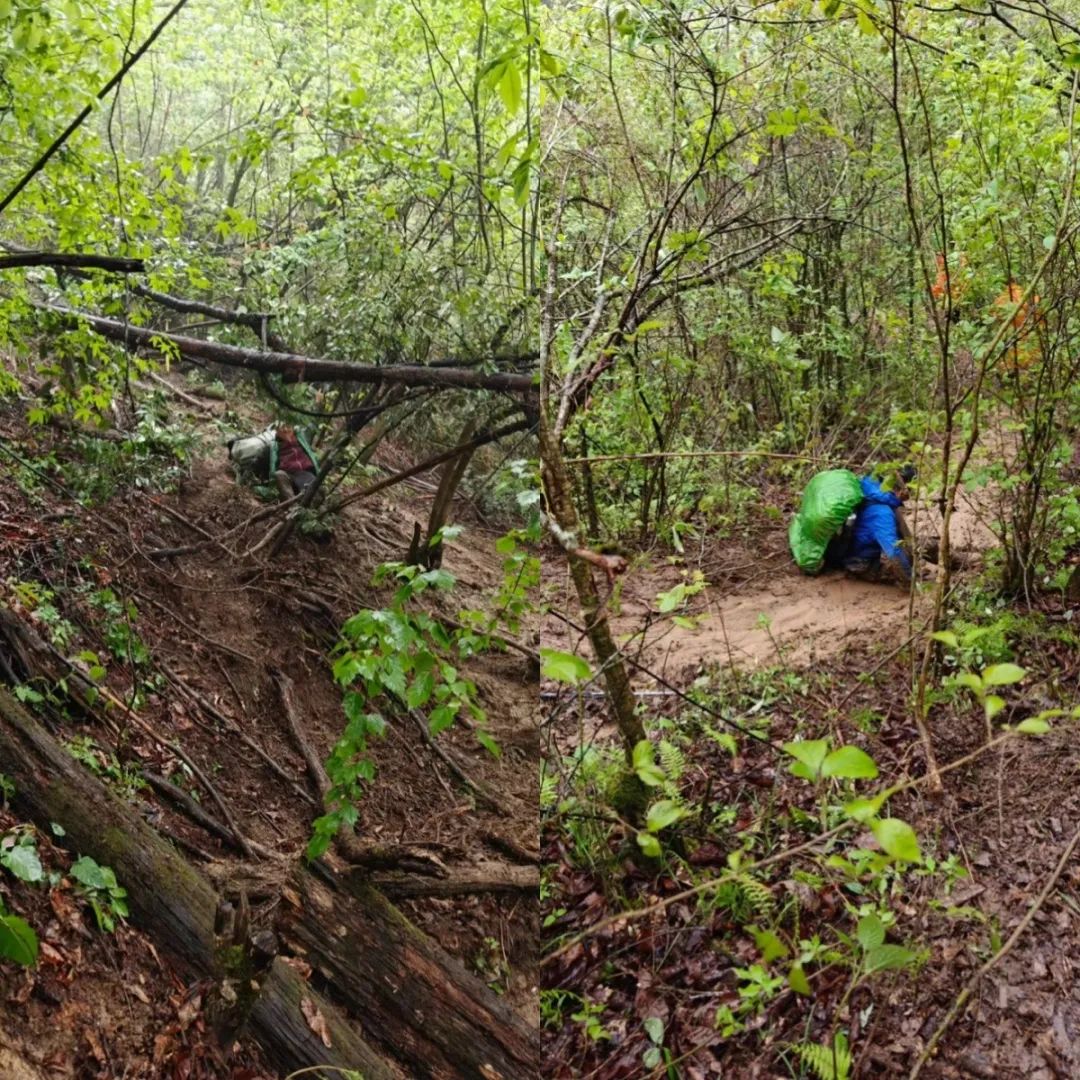 路?已经不算有路了。长时间的雨水冲刷,已经将泥土松散,近 70 度下降的陡坡,还有深一脚浅一脚的林间溪涧,一步三滑的湿泥路,最后不得不用上“屁降”。