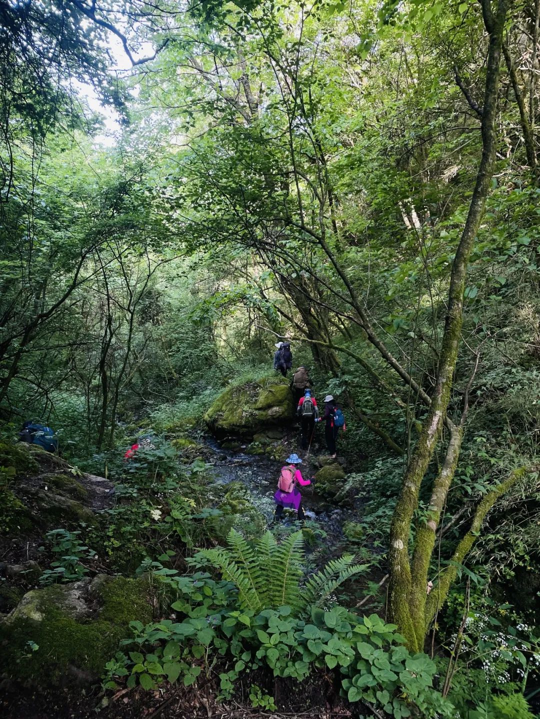 四面被黑色岩壁所环绕,除了爬升、下降和穿越密林,几乎每到一个谷底都会遇见溪水。溪水有大有小,小的很容易就跨过去了,大的还需要临时造桥,这里仿若一个失落世界。