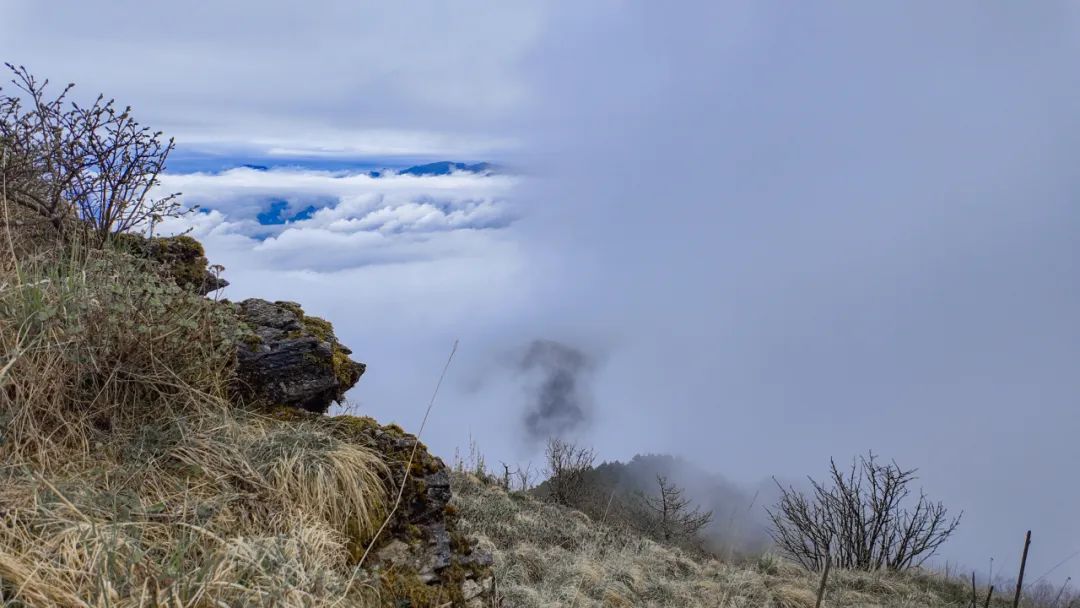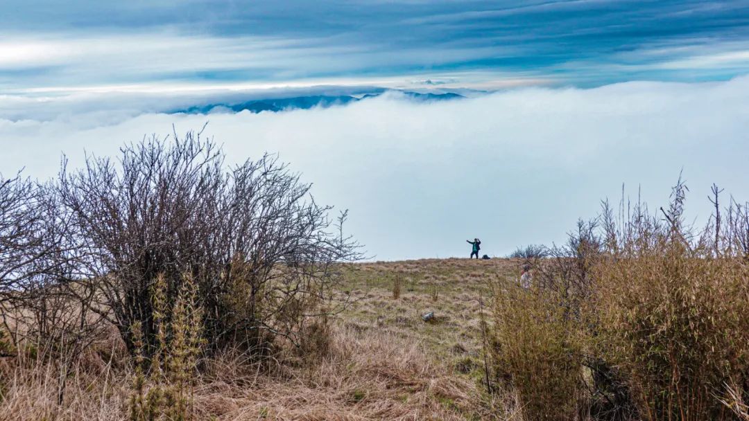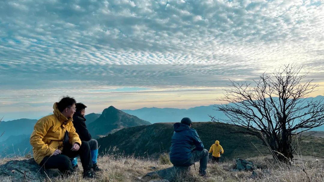 找个背风的山窝坐下来,对面是重重山峦,云海就这样毫无征兆地出来了,还哪里顾得上啃面包,纷纷丢下背包当然冲到最前面。