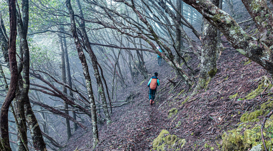 过了老君寨,我们便不再沿山脊走了,往左横切下山谷。从下切开始,真正的密林穿越就开始了,穿过风中低语的杜鹃林,千回百转的一路蜿蜒下坡,云雾在箭竹林和杜鹃林中缥缈、神秘、野性.....