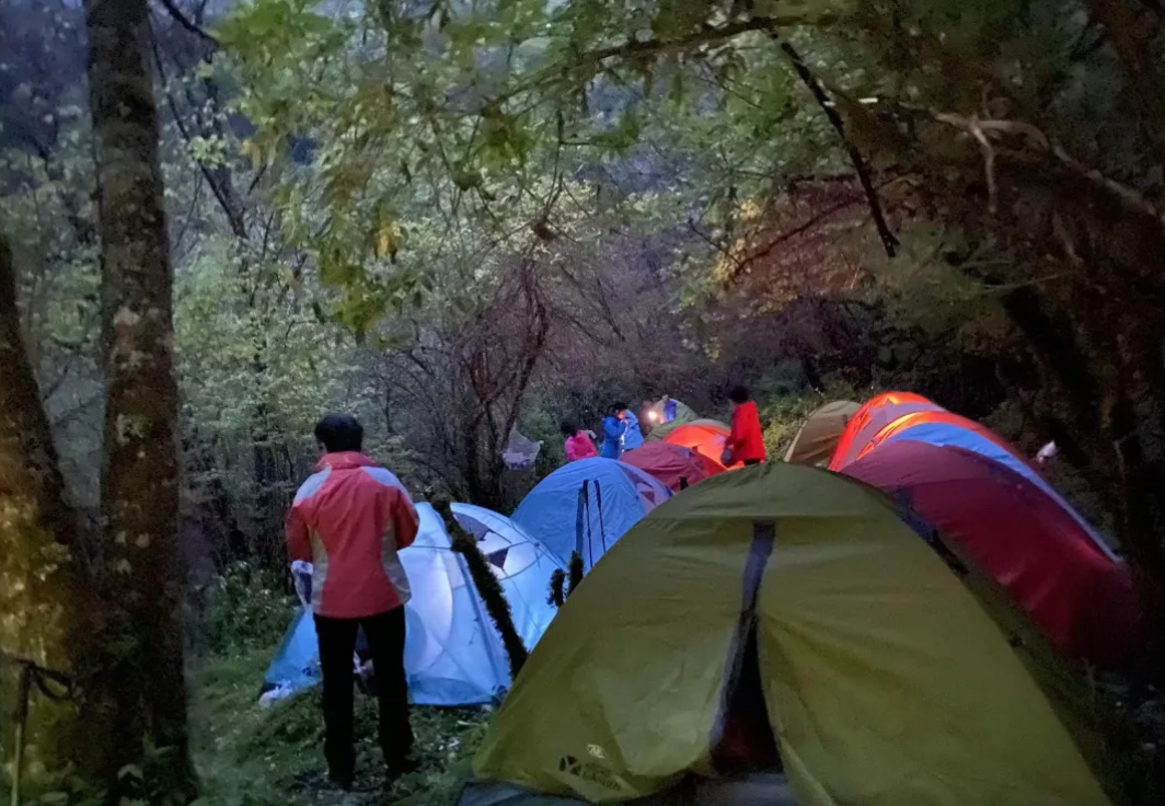 大概前一晚休息不足,抑或是当天实在太累,晚饭梳洗过后,大伙儿纷纷钻进帐篷,营地海拔下降,这夜伴着流水潺潺和鸟语蛙声进入梦中,一夜好眠。