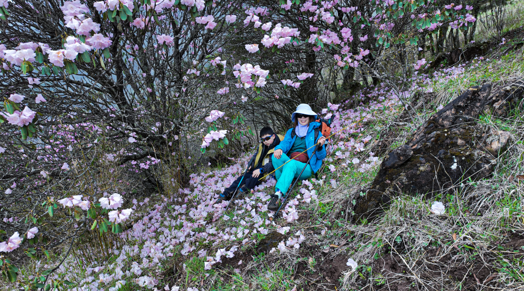 五月初春,杜鹃正当盛时,粉色的大骨朵,开在我们头顶上,任时谁走过,都会瞬间面色发亮,在这起起伏伏的山林草甸中,已然可以寻觅到春天环绕群山的悠然滋味。