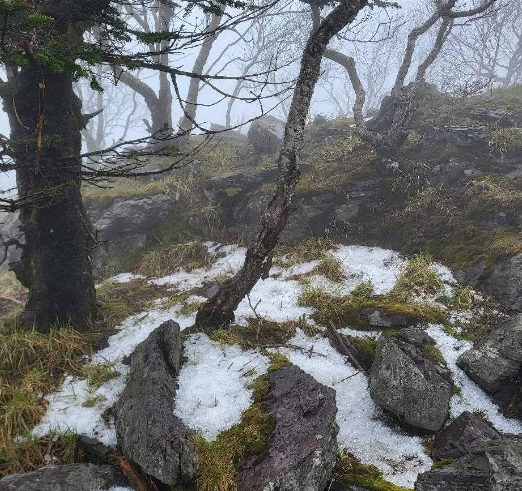 冲顶老君山的最后一段上坡路,甚至毫无防备地下起了雪籽❄️,能见度不足三米!山顶上甚至还留有冰凌。
