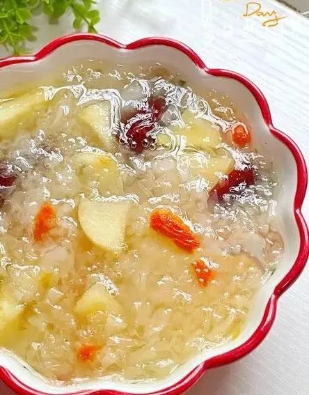 秋燥伤肺,苹果干与银耳、百合同煮成羹,润燥养阴,缓解皮肤干痒、咳嗽少痰。