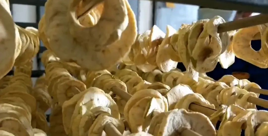 串起来用低温风干的方式让苹果水分蒸发,简单的工艺,最大度保留苹果中的营养成分不流失,过程中不添加助干剂,没有为了好保存而熏硫;保证苹果本身的滋味;15斤鲜果,最终只能制作出1斤苹果干~