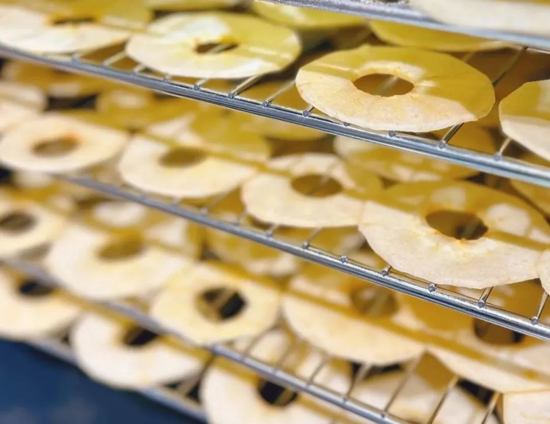 这样慢烘出来的苹果干,没有被过度氧化,颜色保持原色,更健康~