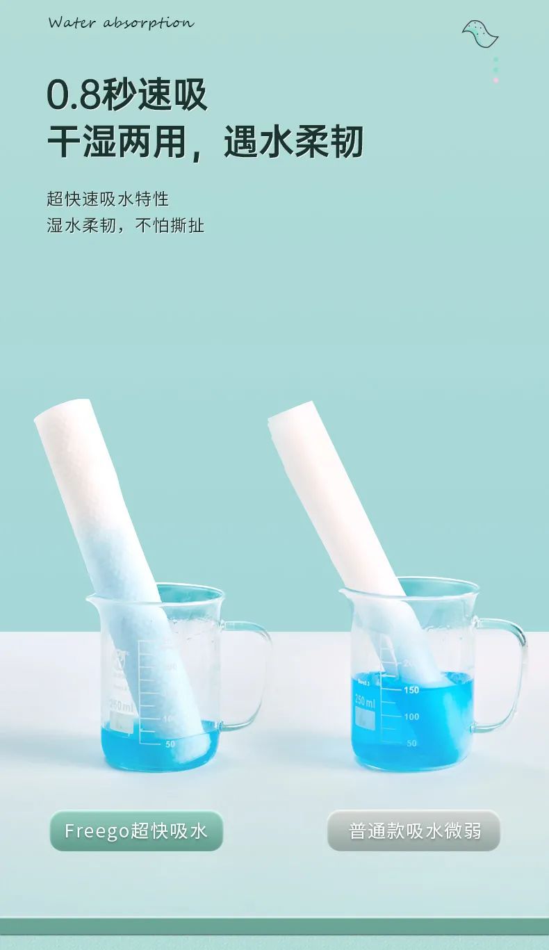 洁面后用干洗脸巾吸水,洗脸巾的吸水力强,0.8秒瞬吸,小仙女们试用后都被这优秀的吸水性所折服;洗脸巾湿水后柔韧,无毛絮,不像很多普通洗脸巾湿水后一扯即破,Freego洗脸巾可反复搓洗。