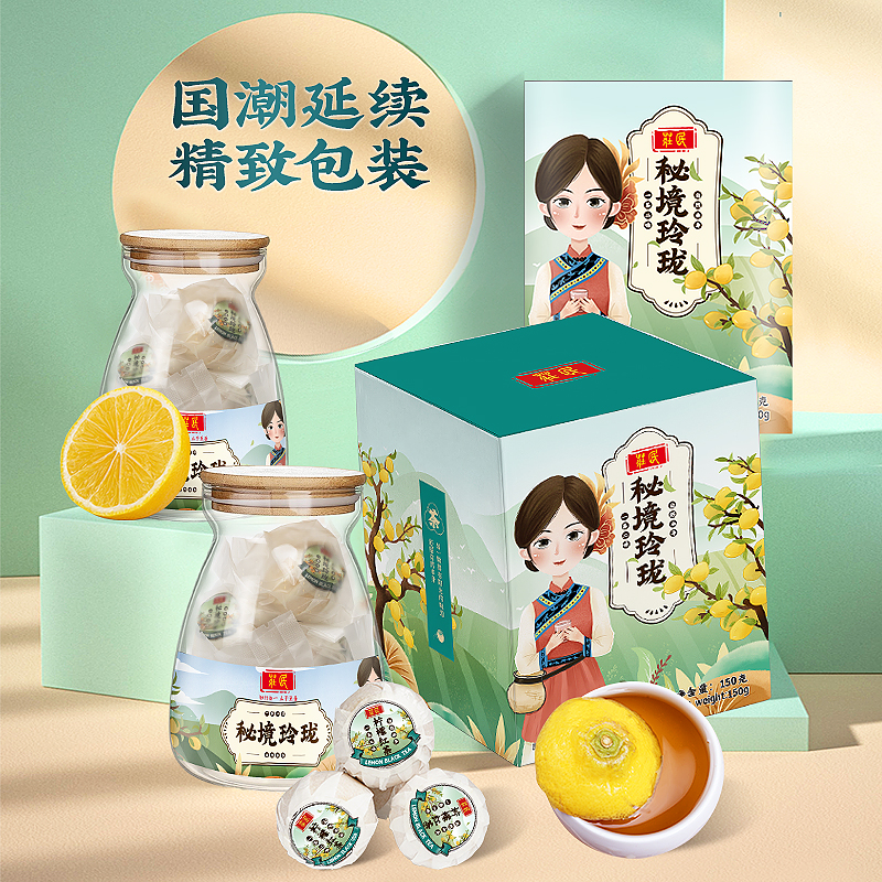 外包装由高端设计师创意作出,延续国潮画风,绘画出清新可爱的采茶姑娘手捧柠檬茶,构思和上色完美结合,清新而不妖娆。画面上采茶姑娘红色的衣裙和柠檬树上黄色的柠檬果相对应,在整个山间绿色茶园背景的衬托下,与画面产生了鲜明的对比,让人的内心欢快无比,仿佛身人在家中坐,犹如森林间般的完美感觉。