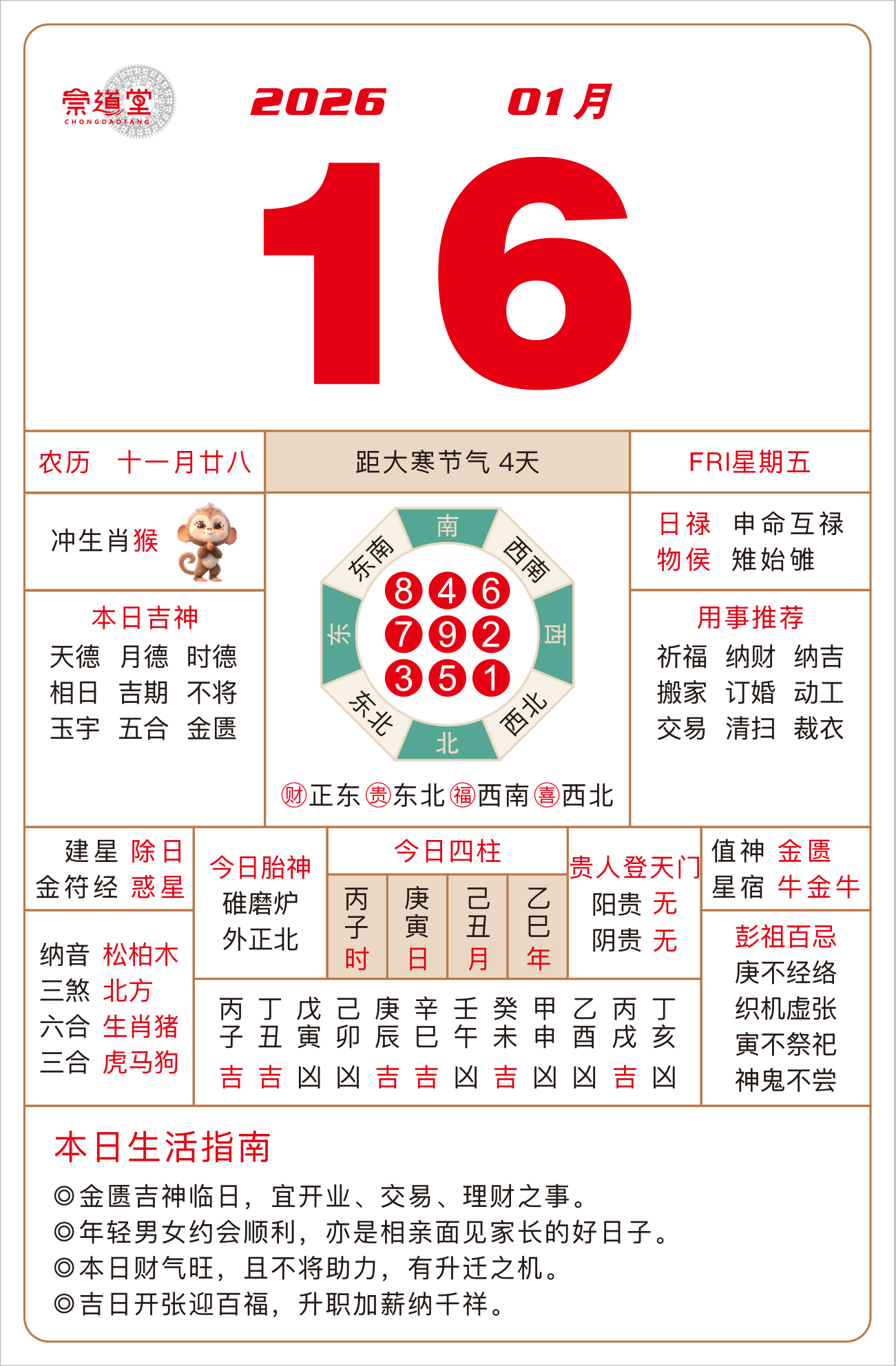 2026年1月28日 农历十二月初十 壬寅日 冲猴