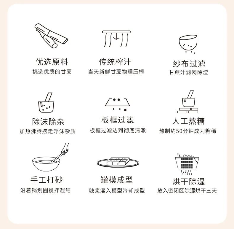 丰富制糖经验的师傅们,会在甘蔗采获期内质刚好的时候,白天及时采获,通宵加工,尽量留住甘蔗的那份自然新鲜。从甘蔗离开土地到加工区,榨汁到几度过滤除杂,呈现蔗汁的清澈感是很重要的一个加工节点,再到熬糖打砂,工业化快捷的时代,感谢还有这种传承至今1400多年的红糖技艺,才有如今我们这样自然工艺得来的红糖。