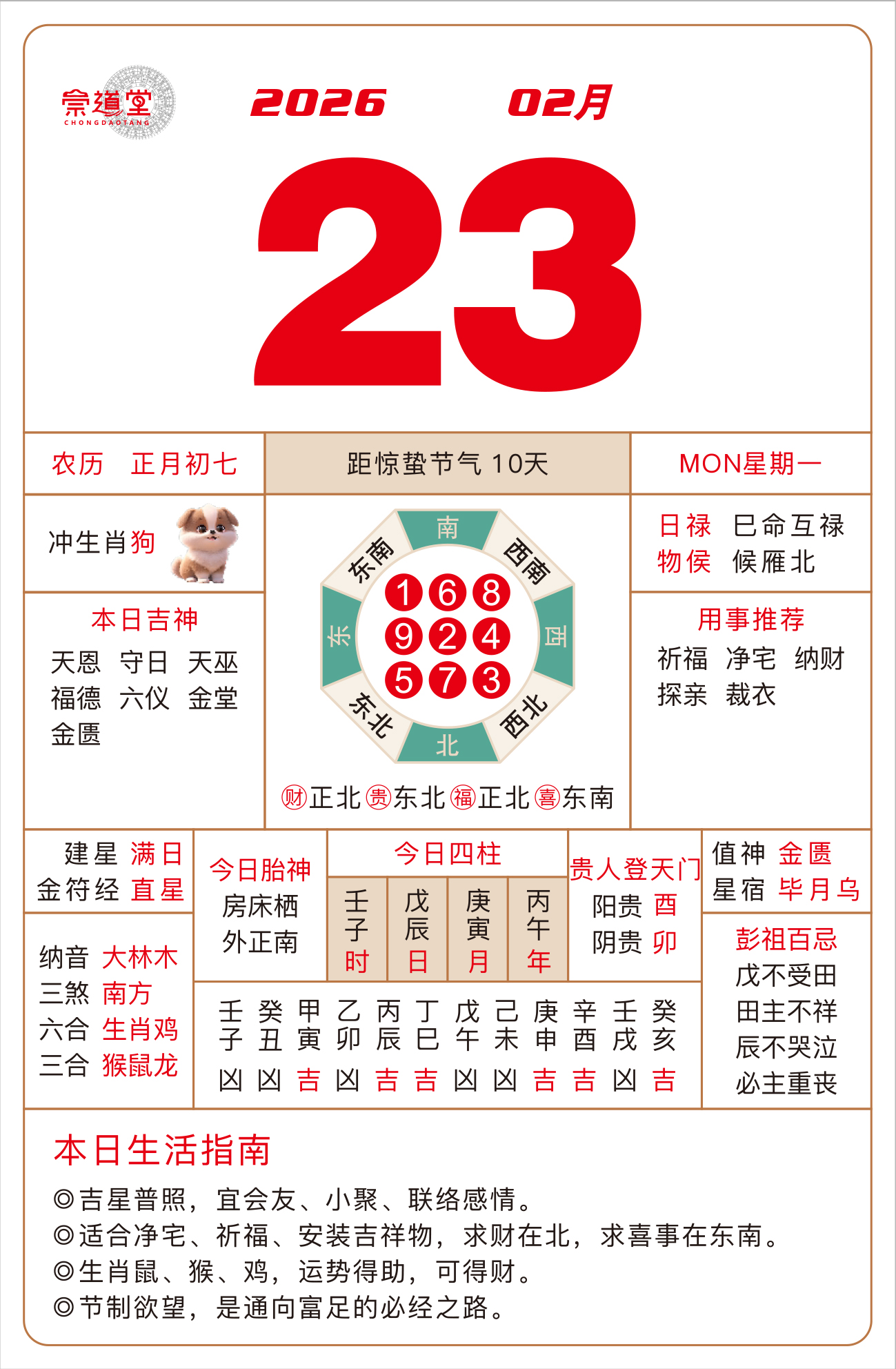 壬戌、癸卯、壬辰、甲戌、甲辰、乙卯等日主,今日宜静不宜动,建议静坐冥想、焚香抄经,尽量心平气和。