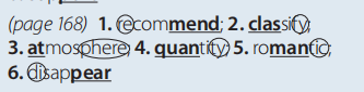 A (page 168) 1. ba-na-na (3 syllables); de-mand (2 syllables); i-den-ti-fy (4 syllables); re-pro-duce (3 syllables) 2. Bold syllables are stressed. ba-na-na; de-mand; i-den-ti-fy; re-pro-duce 3. banana (2 different vowel sounds, with two schwas /bә’næ-nә/); demand (2 different vowel sounds