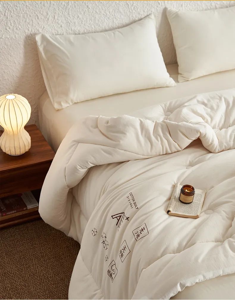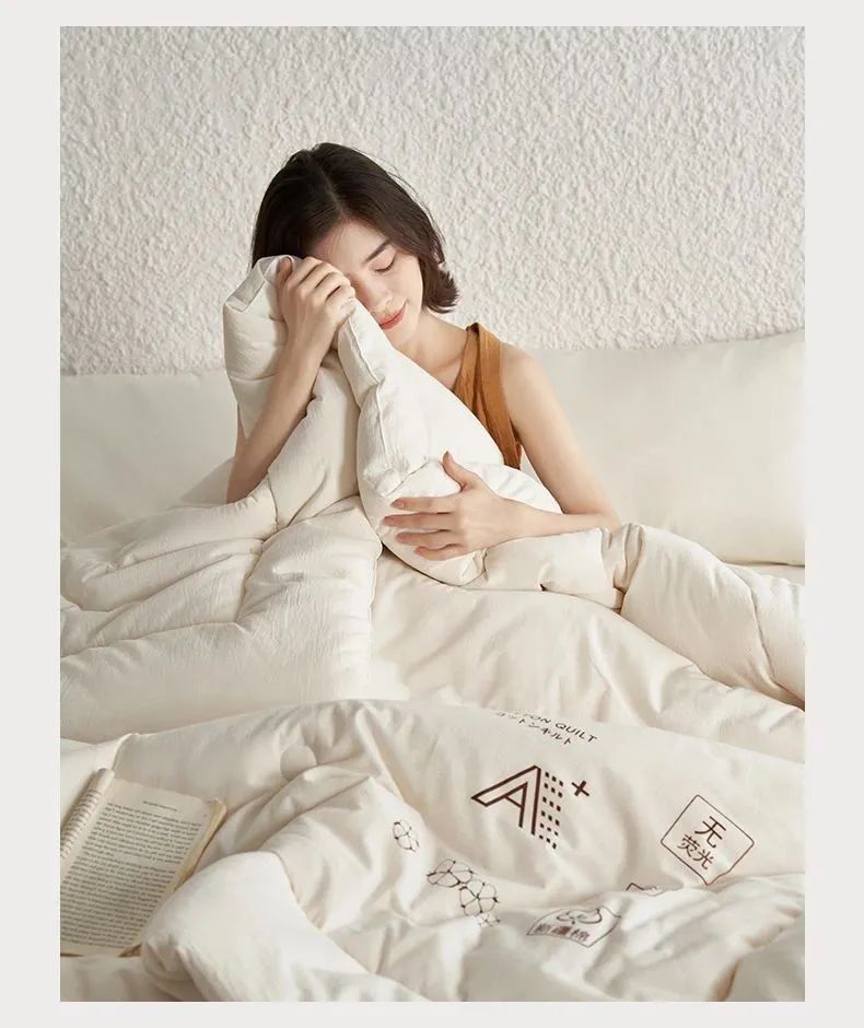 被套是高支高密工艺处理,剔除棉花中的杂质、浮毛和短纤维,只留下柔长、有劲力的棉花长纤维。触感细腻、轻柔、亲肤,可以不加被套直接盖(也可以套上自己喜欢的被套用)。