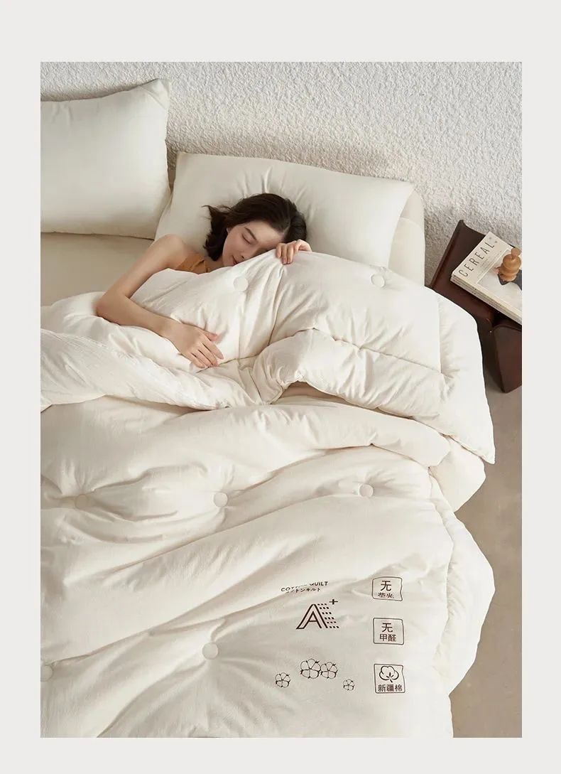 棉花被是国家A类婴幼儿级安全标准,无甲醛、无荧光增白剂、无致癌芳香胺,可以放心贴肤使用。