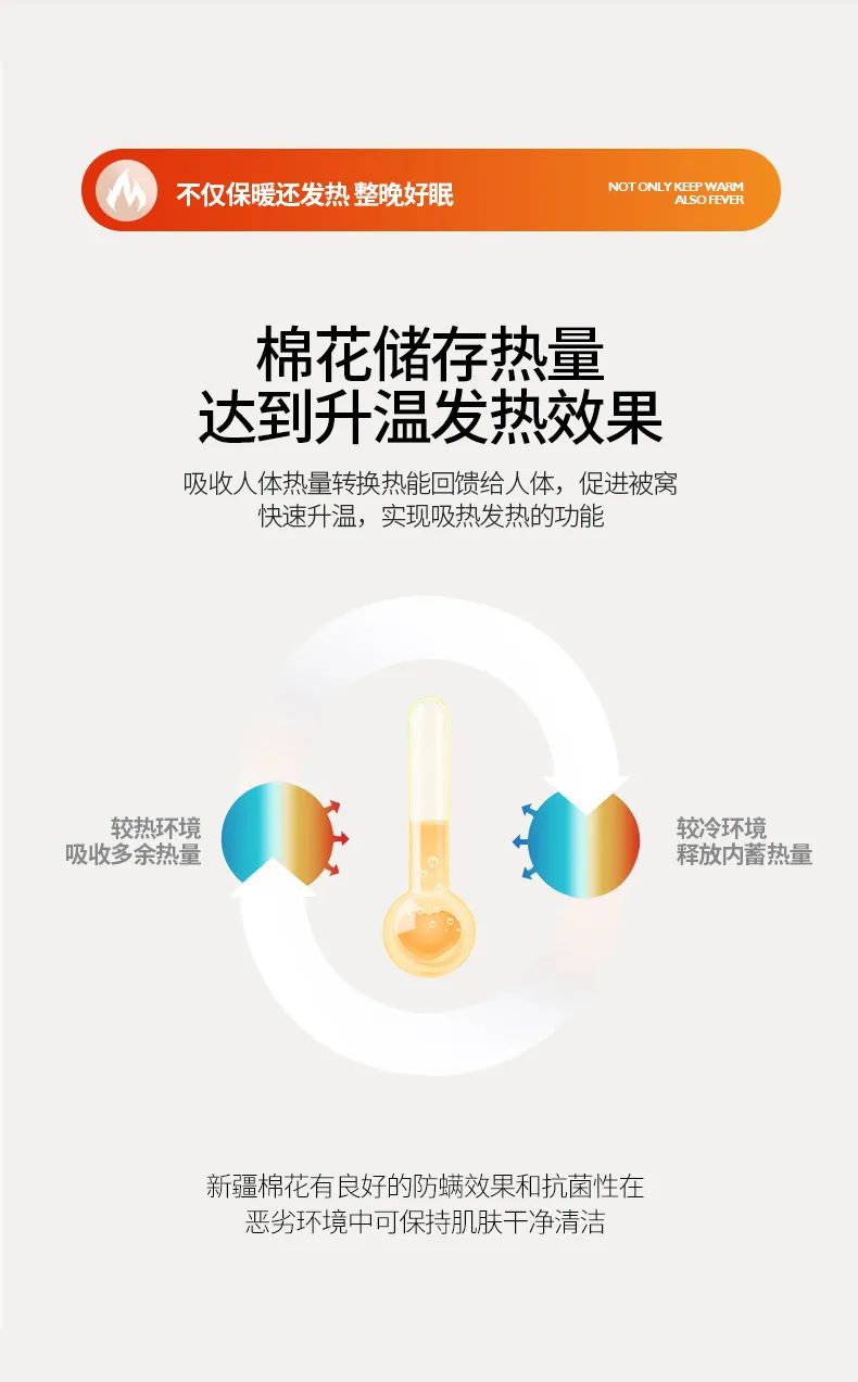 新疆棉透气性特别好,脱脂处理使被芯用的棉花吸水、透气性增强,被子整体具有特别好的排湿排汗功能,保暖却不闷。