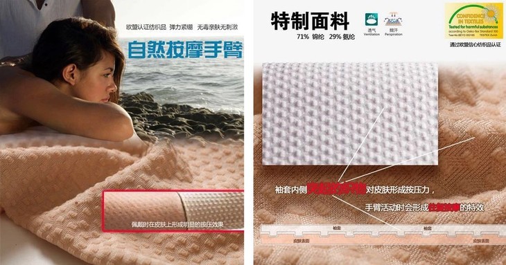 作为欧盟认证的纺织品,无毒亲肤无刺激。360度全向均匀弹力,保证袖套紧紧束缚手臂,不轻易松滑移动。袖套口内外侧采用创新的蜂巢式硅胶设计,保证张紧度,不卷边,不下滑。