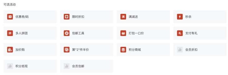 2. 本期支持查询叠加的插件和优惠:优惠券/码、限时折扣、满减送、秒杀、多人拼团、包邮工具、打包一口价、支付有礼、加价购、第“2”件半价;积分商城、会员折扣、积分抵现、会员包邮