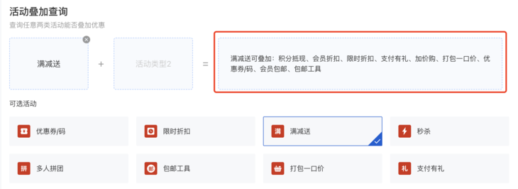 任选1-2个插件,可查询该插件是否可叠加、优惠计算顺序。详细叠加互斥规则参照 https://help.youzan.com/displaylist/detail_4_4-2-492951. 功能入口:应用-营销玩法-活动叠加查询