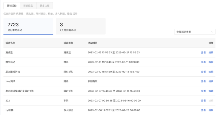 1.1 支持查询全店 优惠券、满减/送、限时折扣、秒杀、多人拼团、赠品 6大插件进行中的活动