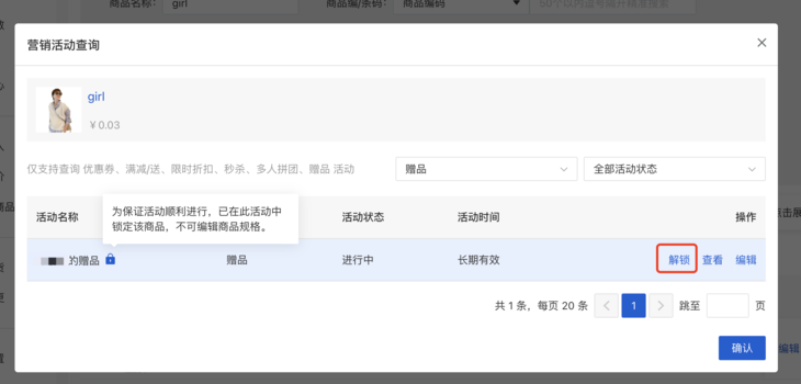 2.2.2 点击“编辑”,可前往该活动的编辑页,对活动信息进行调整 2.2.3 赠品活动,在赠品最后一个被领取的赠品有效期到期前,会锁定对应商品的规格编辑;用户久未领取时,对商家管理商品带来困扰。点击“解锁”,可解除对应商品规格编辑的锁定,允许商家编辑商品规格。注意:若解锁后编辑规格,已发放未领取的赠品将无法兑换,请提前周知用户。