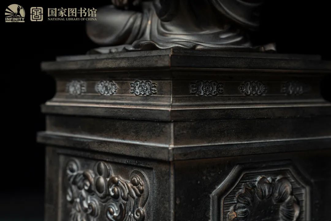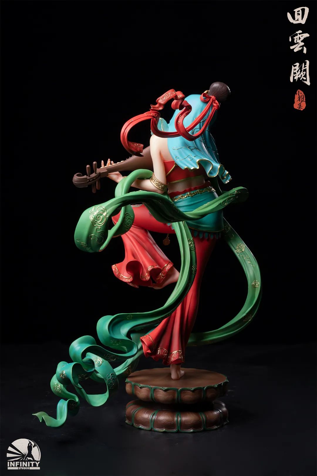 舞伎立于莲花地台上,倾身低头,双手横抱琵琶