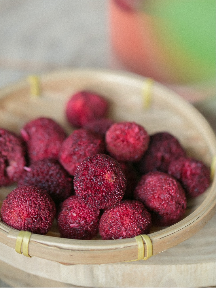 来自福建省的浮宫杨梅,已经有700多年的历史,个个色泽红润发紫,果大,味甜,冻干口味酸甜饱满有层次