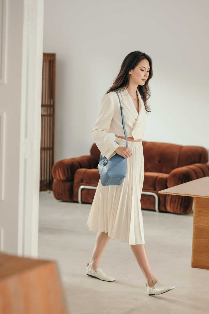 白色是高级的,是浪漫的。一身白色最能让女人变得干净又迷人,有其他颜色无法取代的吸引力。解构短款白西装,让白色LOOK更有层次感,米白色百褶裙,沁人心脾的优雅气质~