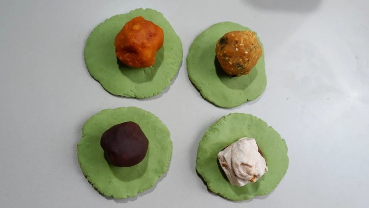 取一个面团按压成片状,放上馅料并包裹紧实