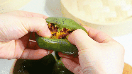 3/青团在蒸制的时候,蒸熟即可,切勿蒸太长时间。时间太久,表皮容易塌陷,看起来不够美观。