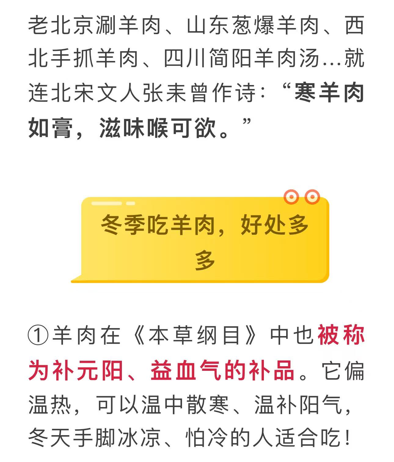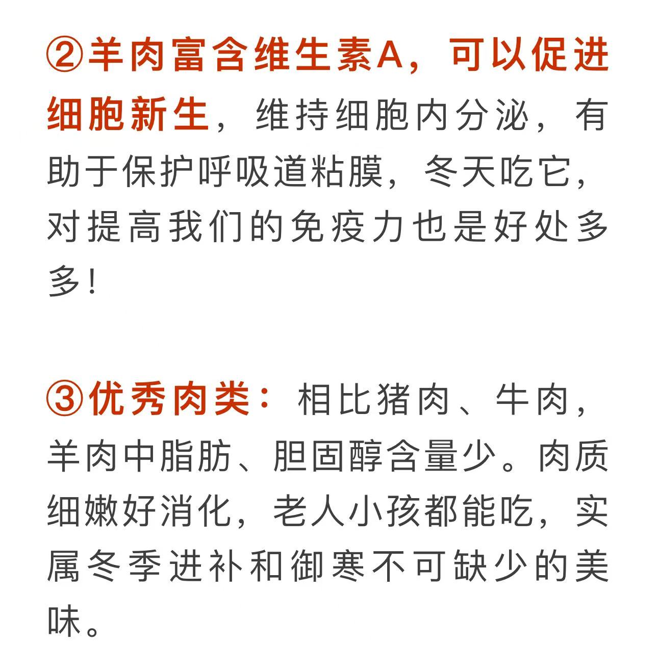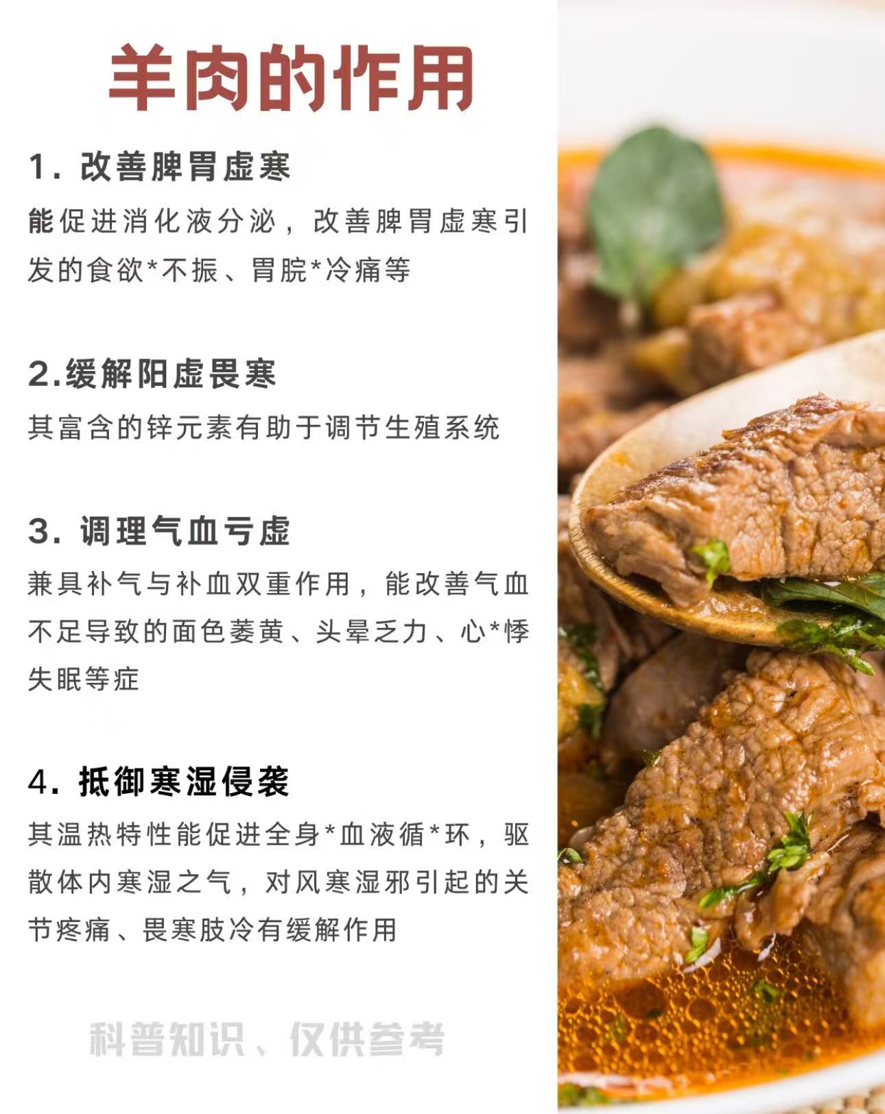 羊肉性温热🔥,冬天吃羊肉,可助人体阳气升发⬆️,抵御寒冷🥶。