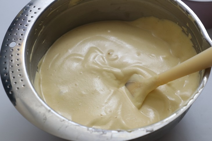 9.拌匀的蛋黄糊再次倒剩下的三分之二蛋清中,用切拌手法拌匀。