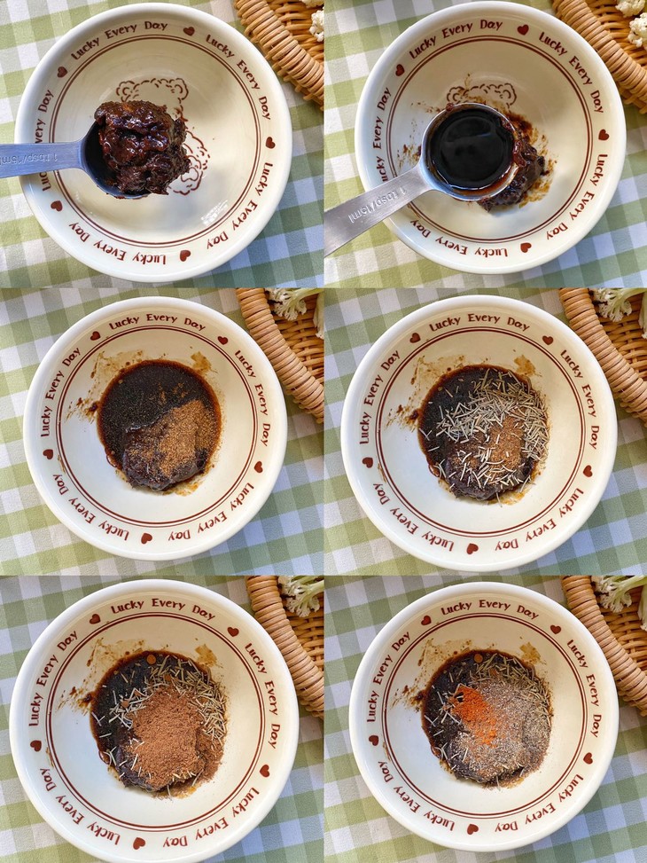 2、取一干净的碗,放入豆瓣酱、生抽、孜然粉、五香粉、迷迭香、黑胡椒、辣椒粉,搅拌均匀
