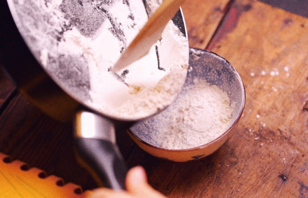 1、将山药粉与大米粉一起倒入锅中炒制,待其微微变黄,关火取出晾凉;