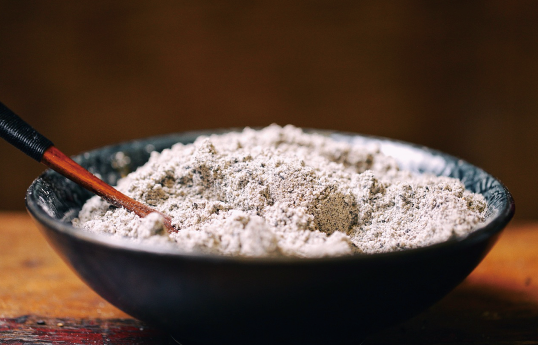 2、把黑芝麻粉、藕粉、炒制好的山药粉与大米粉倒入容器中;