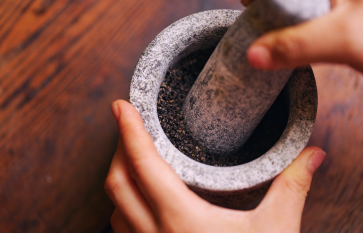 1、黑芝麻中加入白砂糖舂碎,或直接用料理机、搅拌机打粉即可;