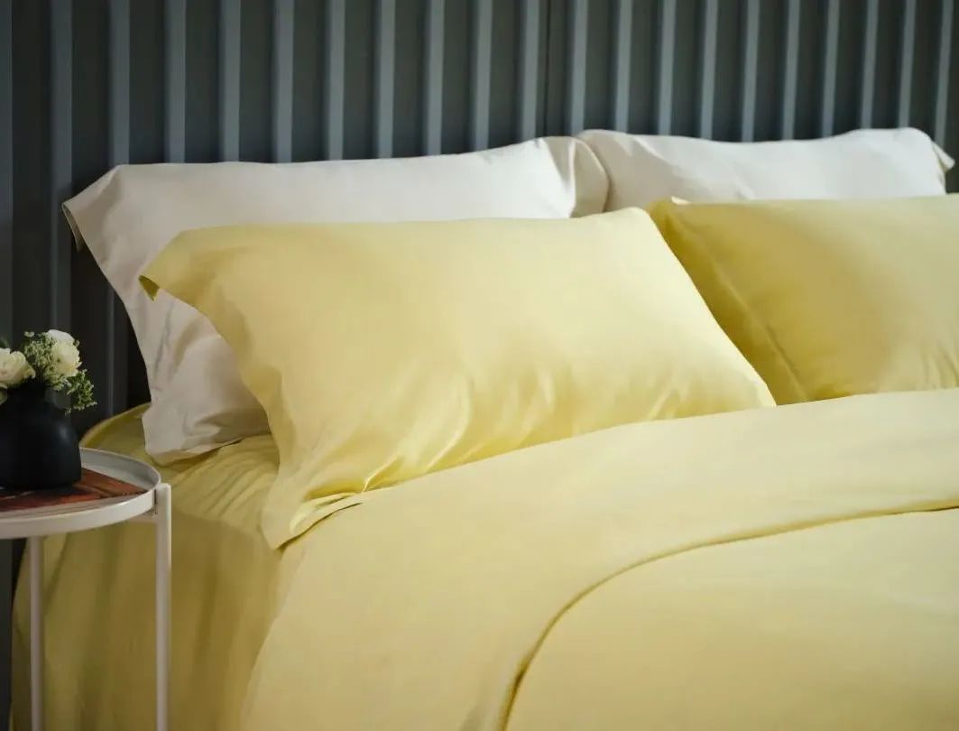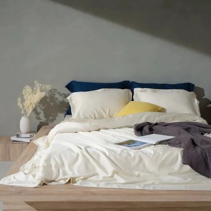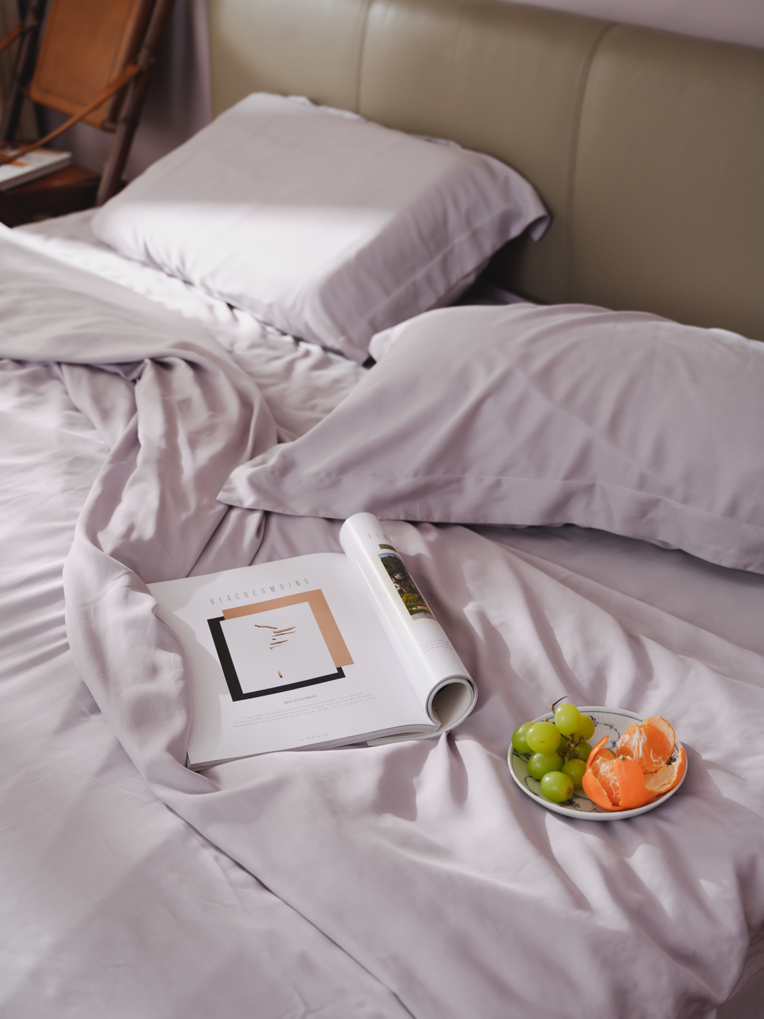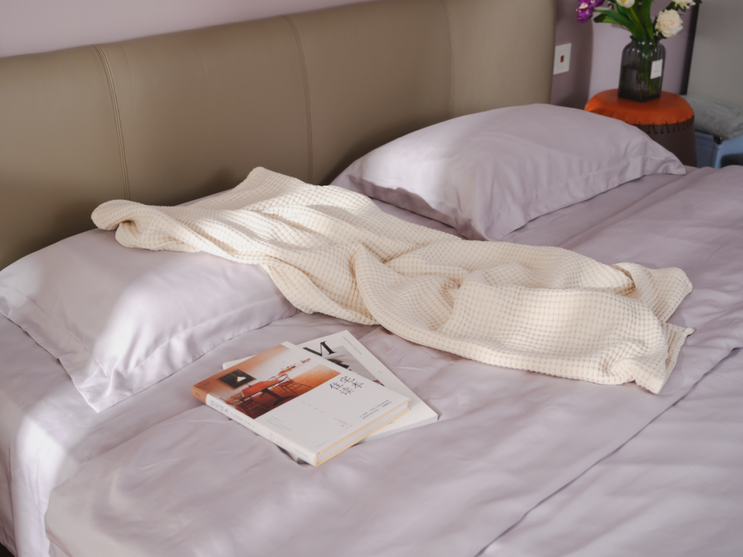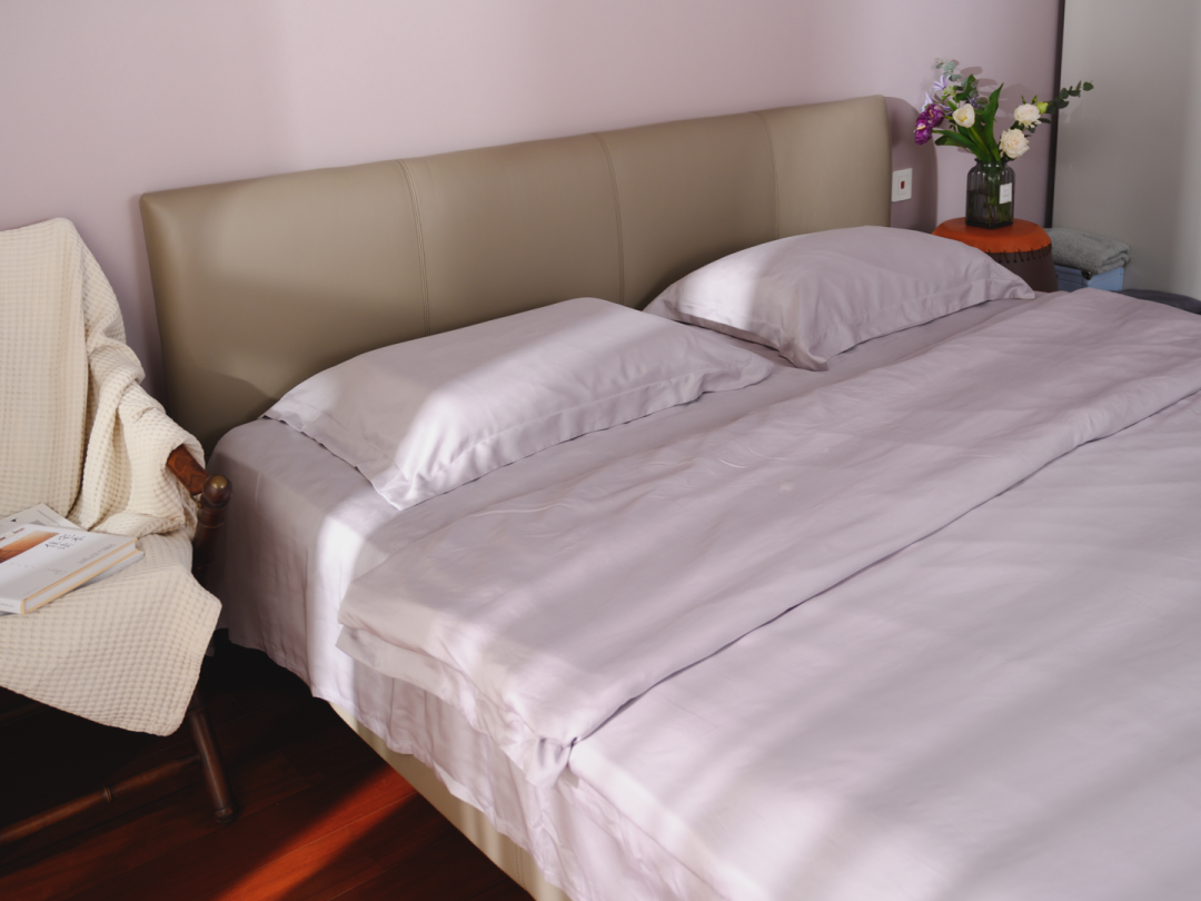 我的四件套一般会选纯色的,更好搭配房间的颜色,很少用花的。这套有三个颜色,沧黛紫、奶油黄和嫩芽白,自带的光泽很有质感。▼