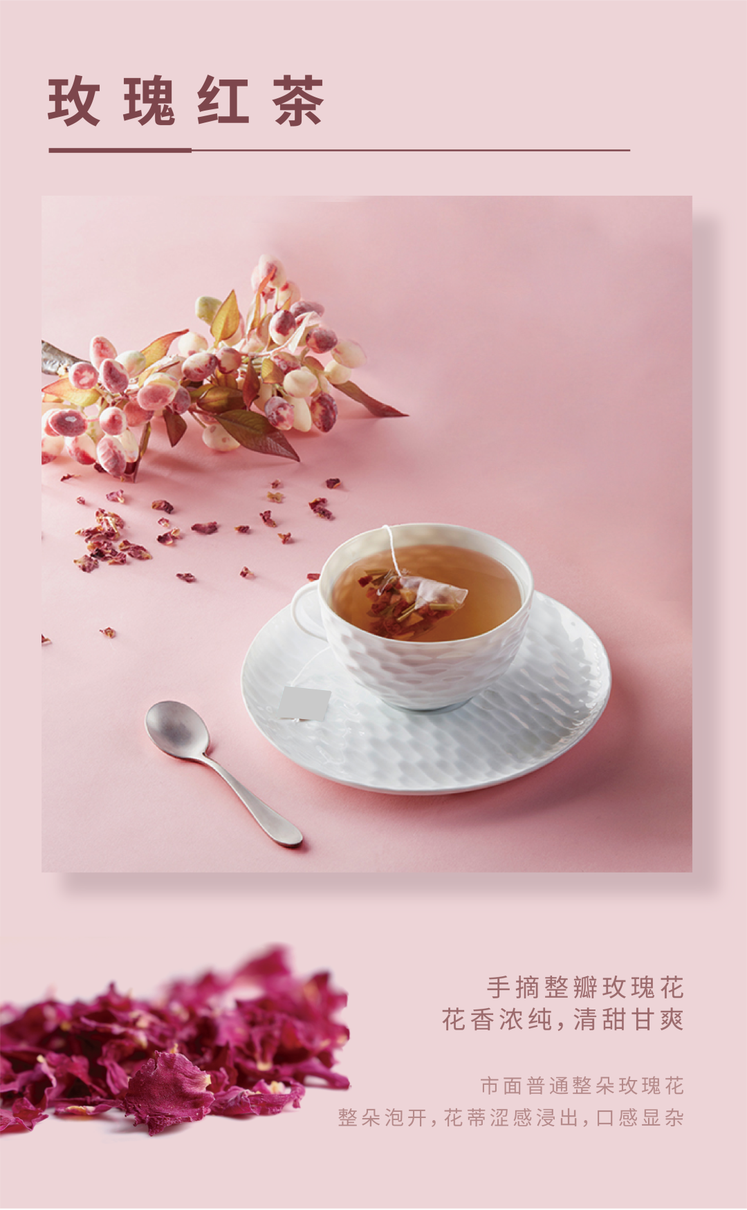当阳春三月的鲜芽制成红茶,遇见五月盛开的玫瑰花,吐露芬芳的茶叶吸纳花香,那杯最极致的玫瑰红茶就此浪漫诞生了。