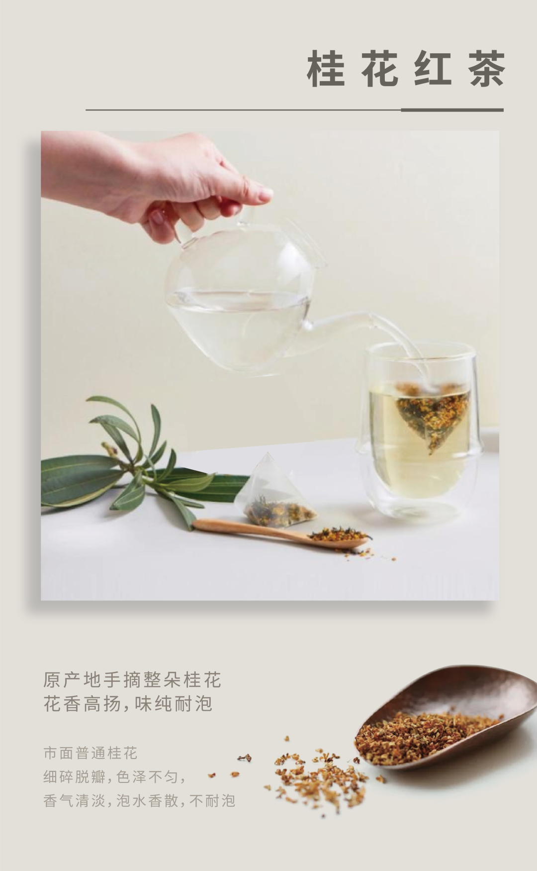 这款桂花红茶可谓用料十足,每100斤桂花红茶,需要用到756斤桂花来酿制,按每泡4克来算,一杯桂花红茶相当于喝到144朵桂花的清甜!