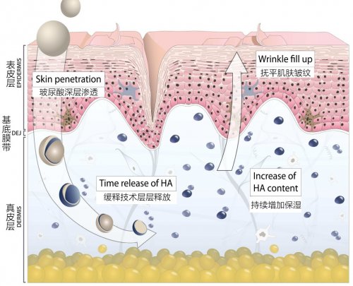 安瓶中运用了护肤黑科技——新型五维度(5-Phase Wirkprinzip) 高效活性作用机理。在第一维度中,安瓶能够为肌肤带去优质的100%高纯度、高分子玻尿酸,快速抚平因缺水产生的干纹,同时还会在肌肤表层形成一道微薄膜来减少水分的流失。进入第二维度后,水分子和玻尿酸结合,彻底消除干纹,并继续进行深层补水锁水工作。第三维度作为核心部分,主要是通过品牌特有的皮肤八大修护者系统来增强皮肤的自我修复能力。第四维度缓释技术则是抑制玻尿酸酶活性,显著延缓玻尿酸的降解,皮肤持续处于保湿紧致状态。安瓶中的玻尿酸分子在第五维度时能在问题点进行局部靶向结合,通过特定的“腔室系统”杜绝“逃逸分子”的出现,从而达到深层抗皱的效果。